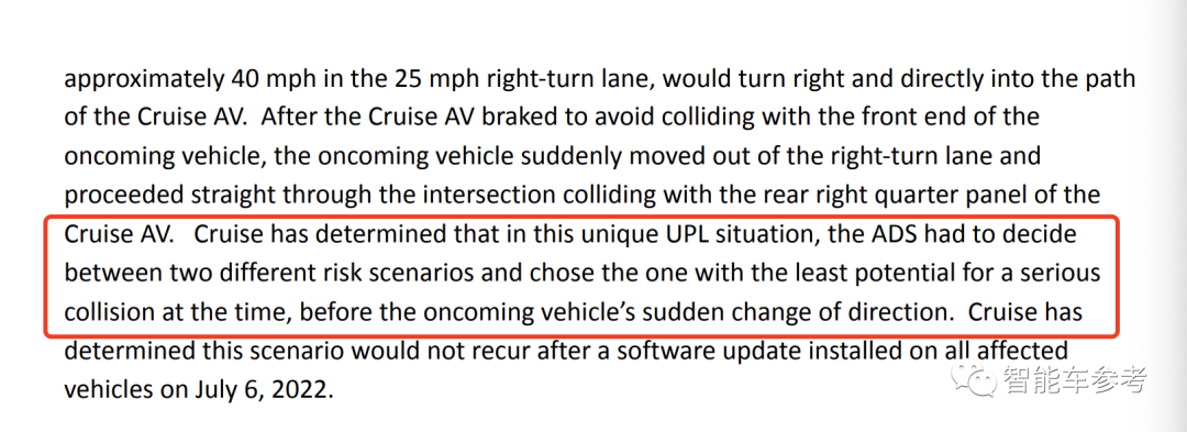 后来Cruise提交给NHTSA的官方文件中显示,无保护左转时,他们的自动驾驶系统会权衡轻重,选择伤害最小的处理方式。