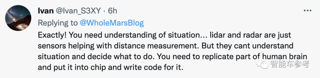 不过特斯拉铁粉博主火星哥@Whole Mars Catalog倒表示,争议点并不在于使用哪套传感器方案: