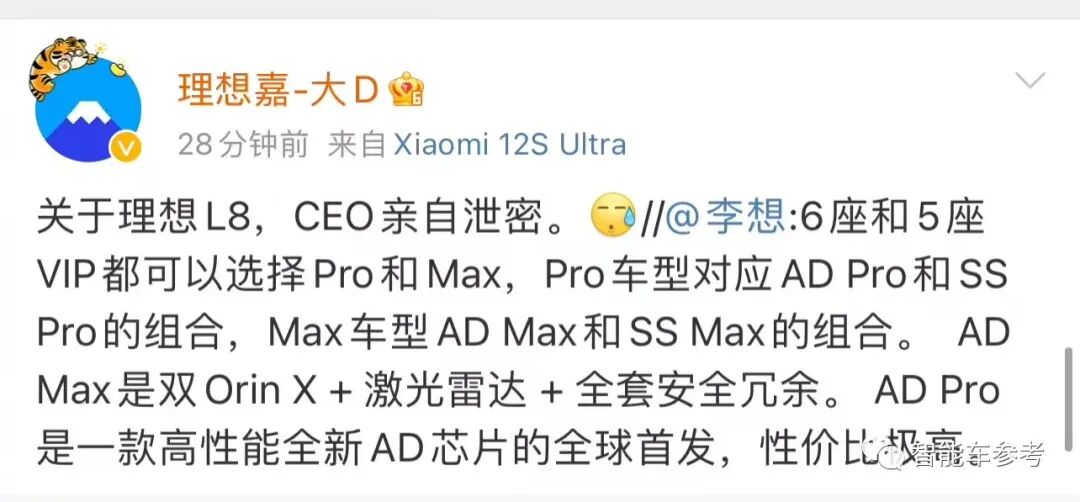 据李想此前微博爆料称,L8座椅数有5座、6座两个版本,同时智能化配置上有Max和Pro高低配,Max将配备双Orin-X加激光雷达,而Pro没有激光雷达,配高性能芯片。