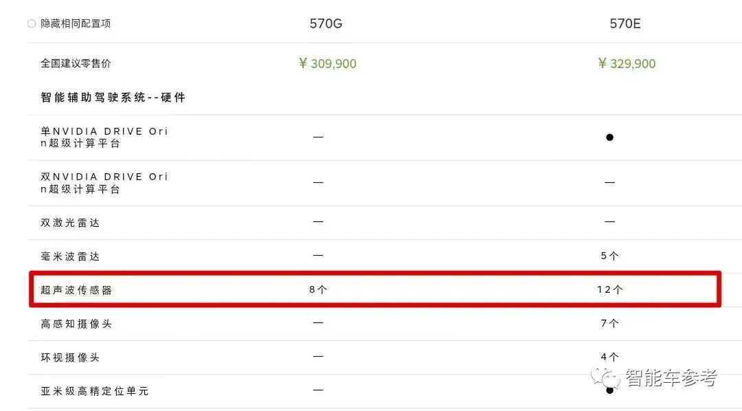值得一提的是,570G除了不可选装,在传感器配置上没有毫米波雷达和摄像头,仅包括8个超声波雷达。