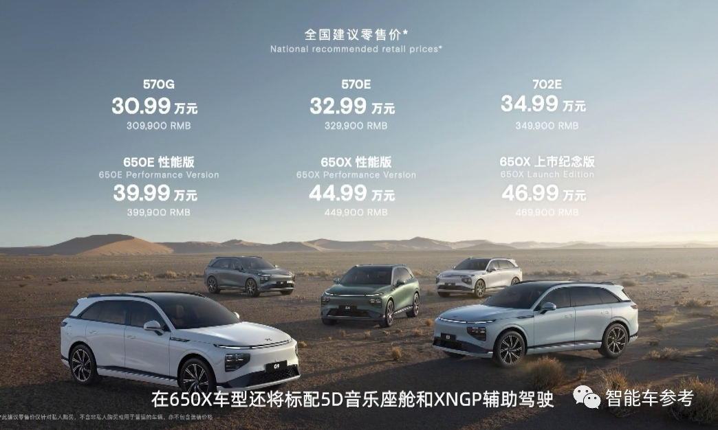 G9共推出三种续航类型(CLTC工况下):570km、650km、702km。