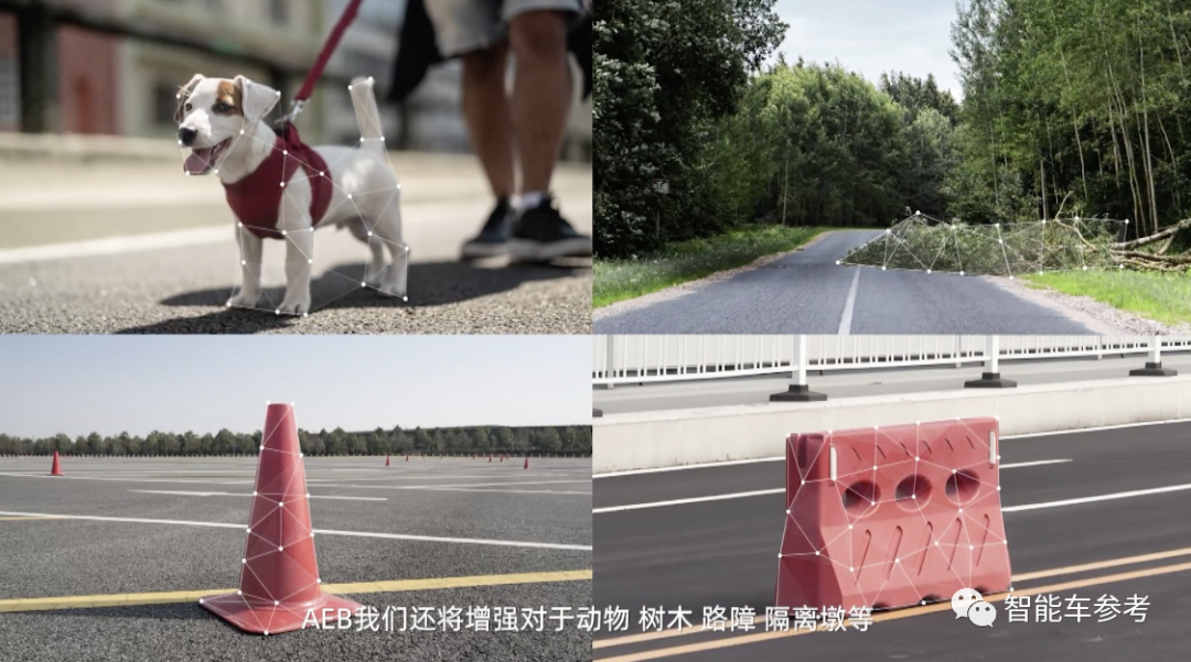 AEB主动安全功能这一点上,相比之前,他们增强了对于动物、树木、路障、隔离墩等非规则障碍物或者静态物的识别能力。