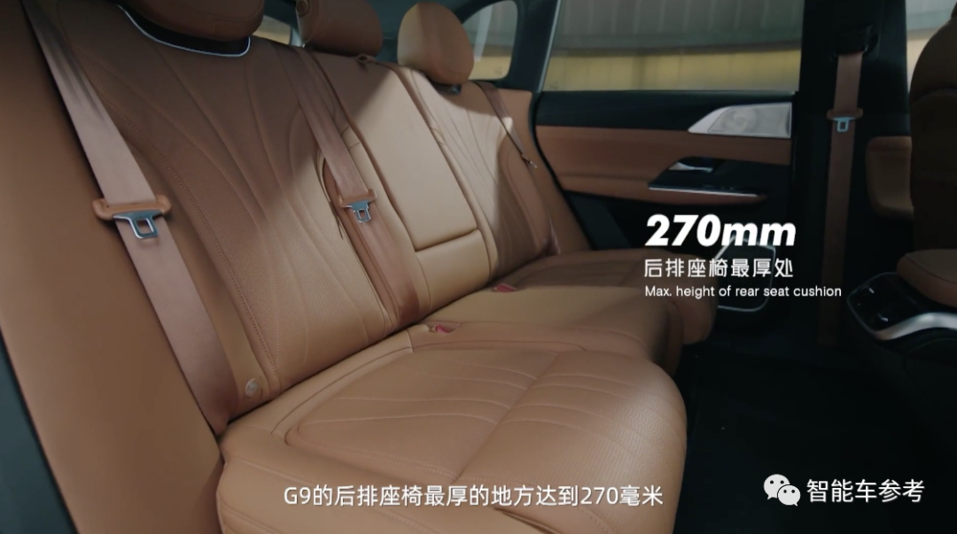 其次是内饰座舱方面。最核心的是对P7的短板——对后排座位太短进行优化。G9的后排座椅长500mm,最厚的地方达到270mm,支持27-37度的电动可调节,也就是可以往后仰10度。