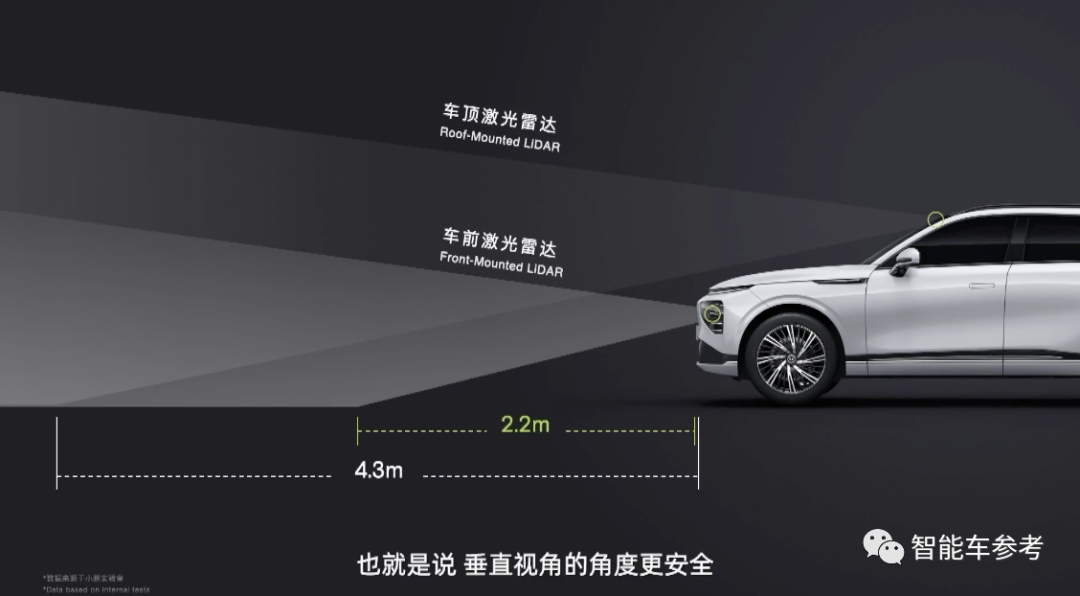 小鹏认为,相比单激光雷达,双激光雷达可以覆盖车前180°水平视角,覆盖范围更广,盲区角度更小;在垂直视角的盲区是车顶方案垂直视角盲区的25%。