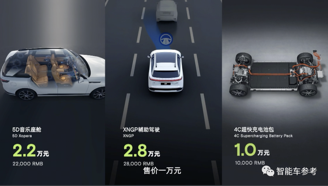 2.2万元的5D音乐座舱、2.8万元的XNGP辅助驾驶、1万元的4C超快充电池包。