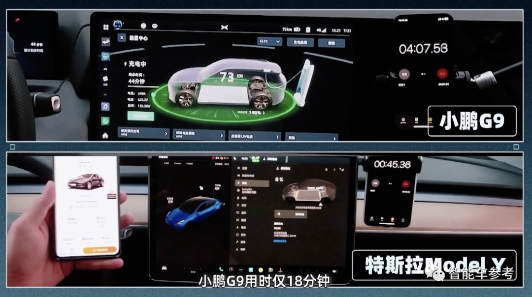 第二种情况,G9搭配小鹏S2快充(充电功率为180kW),Model Y搭配特斯拉V2快充(145kW),在15分钟内,小鹏G9充了40.17度电,Model Y充电23度。