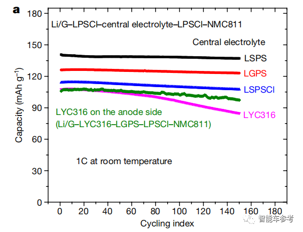 夹在中间的第二层电解质为Li10Ge1P2S12(LGPS),对锂不那么稳定,但不易发生锂枝晶穿透。