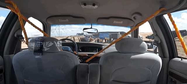 野外无人区,油管博主@TechRax把他的iPhone14Pro绑在主驾座椅头枕上,通过远程遥控汽车,人为制造了两起车祸。