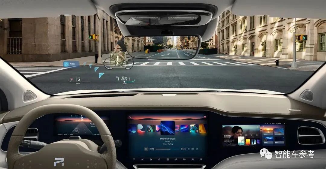AR-HUD显示,来自华为。包括AR路况引导、智驾信息提示画面、车速信息、驻车平视影音体验。