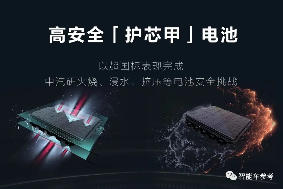 电池方面,他们将其命名为“护芯甲”,这一电池完成了中汽研的火烧、挤压、浸水三大测试。