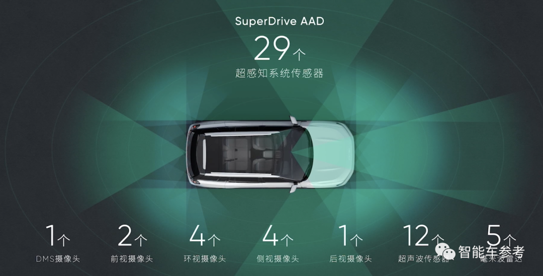 传感器方案上,包括11个车外摄像头覆盖360°范围,但并没有强调摄像头是否为现在流行的800万像素。