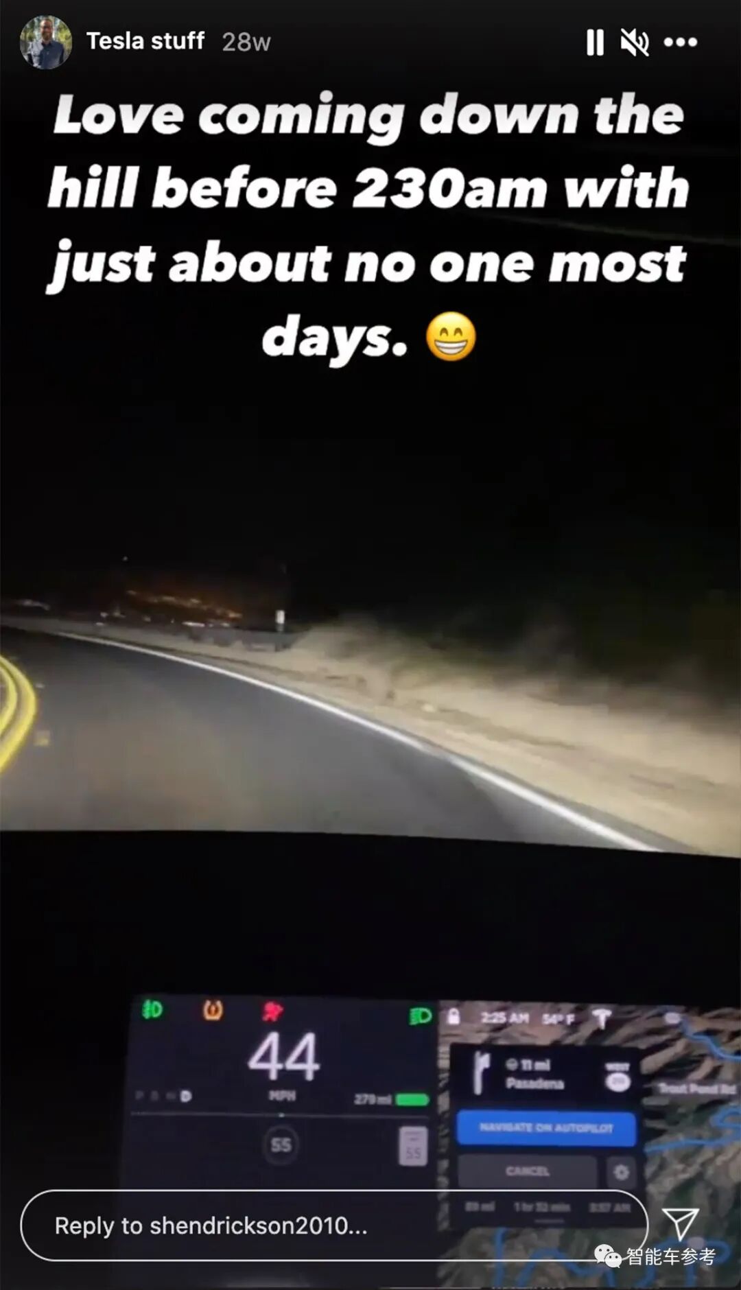 按照特斯拉车主史蒂文之前社交帐号分享来看,这应该是上下班回家路上。