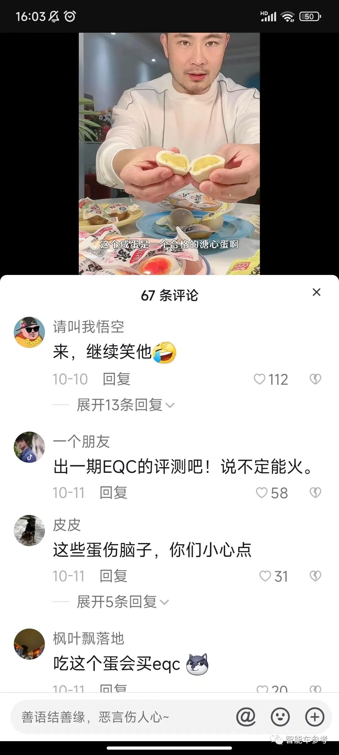 连他发的其他与车无关的吃喝视频,底下也全是被嘲笑冤种的留言: