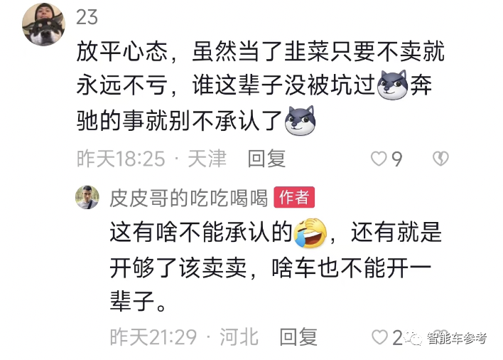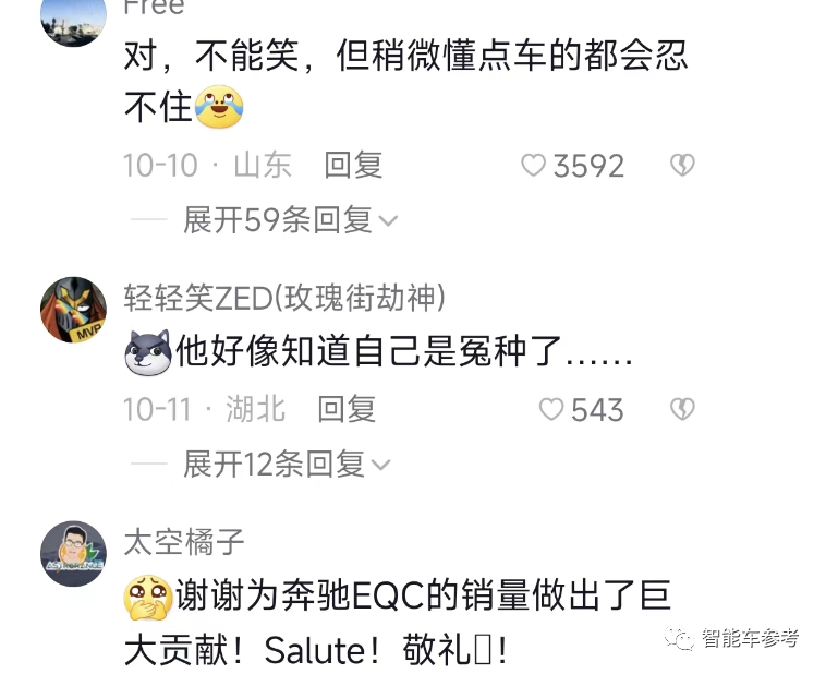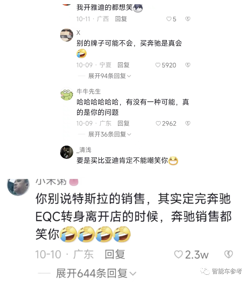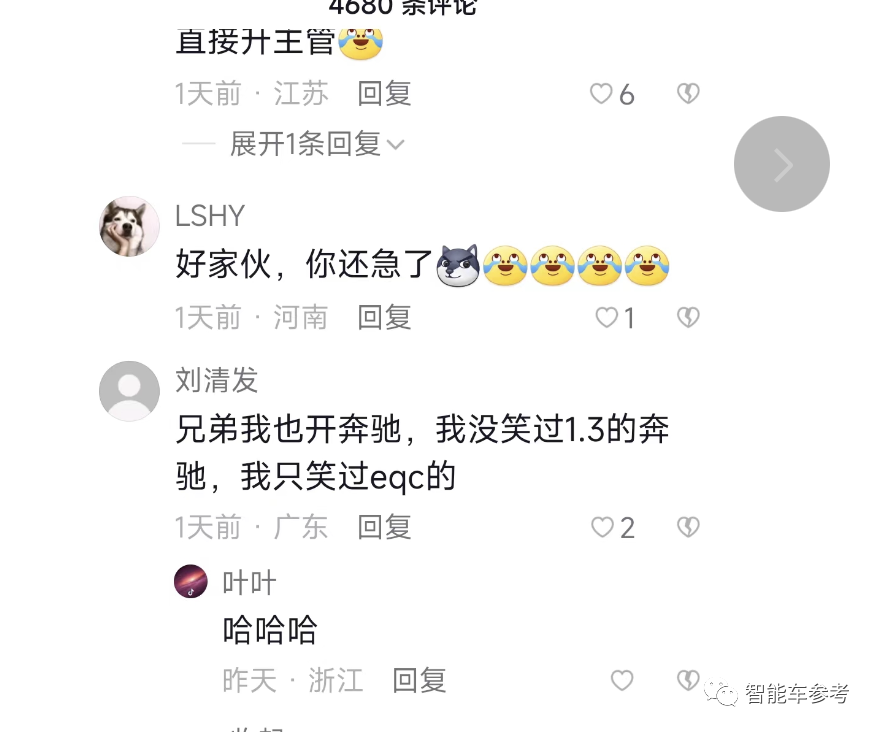 后面的事,就是全网几乎一边倒的嘲讽,普通用户留言、车媒二次创作,加上车主本人之后又发数条视频解释辩护,“买奔驰电车被嘲笑”演化成了车圈的联欢会。