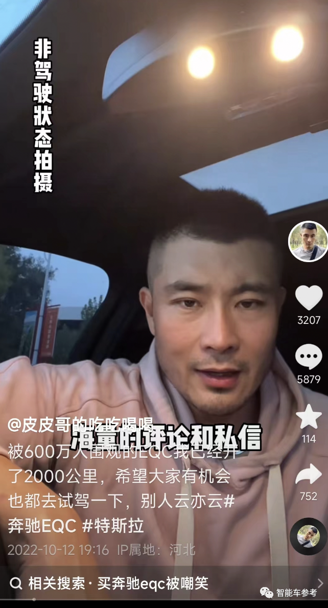 买新车本来是件高兴事,他怎么也想不通为啥买个奔驰EQC要被人瞧不起,于是发抖音吐槽。