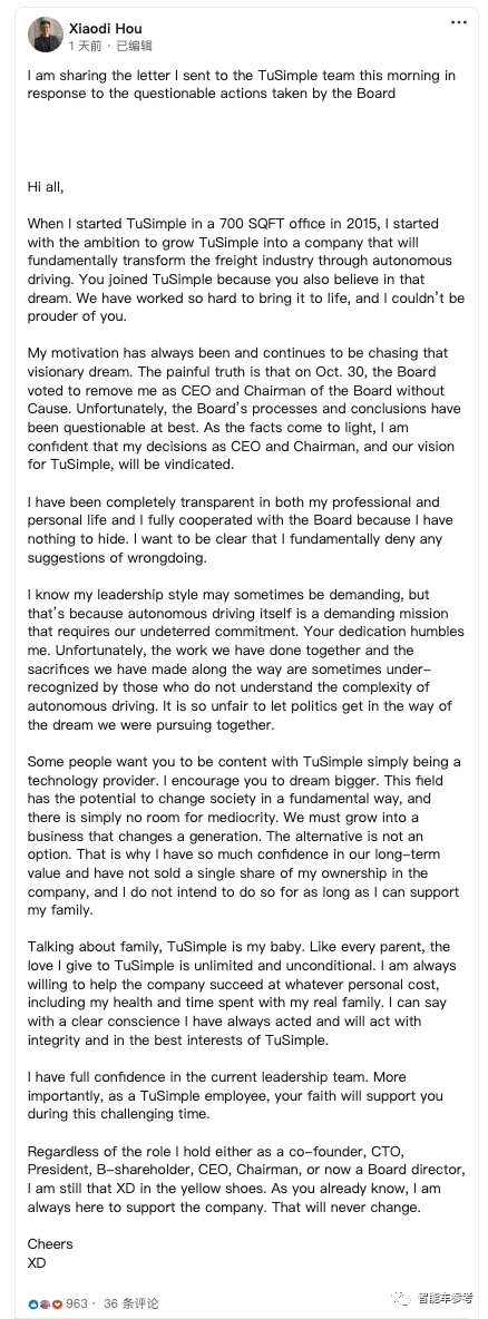 侯晓迪是被迫当CEO的,他不是一个追求权力的人,这一点熟悉或稍微了解图森未来团队的人都知道。他是公认的技术天才,但也附带了直来直往的性格,不是那种城府深厚深谙怀柔之道的管理者。侯晓迪自己在公开信中也承认,领导风格可能有时过于苛刻,原因则是因为自动驾驶本身充满了挑战,不容平庸。