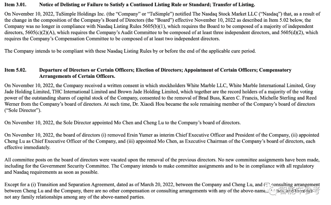 图森公告中还称,之前董事会对董事长、CEO侯晓迪的罢免,主要是董事会审计委员会内部调查后,怀疑他对董事会的坦率和透明度,公司并没有任何外部调查在进行。