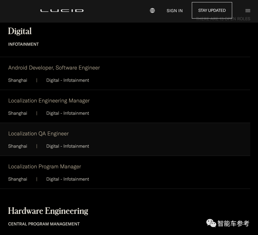 Lucid 在官网开设了14个在上海的职位,涉及硬件工程、供应链、零售、物流、数字和法律领域。职位描述内没有提及招聘的具体人数,但是大多数职位都要求精通中英双语,以及在中国公司两年及以上的工作经验。