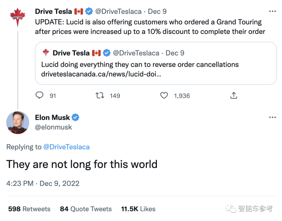 此前马斯克曾嘲讽过 Lucid,说这样的公司除非能大幅削减成本,否则会走向破产。后来马斯克又在推特上指出 Lucid “对这个世界来说并不长久”。