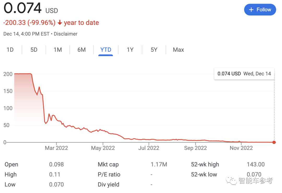 但这依然无法挽救Quanergy的颓势。资本市场上股价一路下跌,11月收到了纽交所退市警告,股价目前只剩0.074美元,公司市值几乎清零: