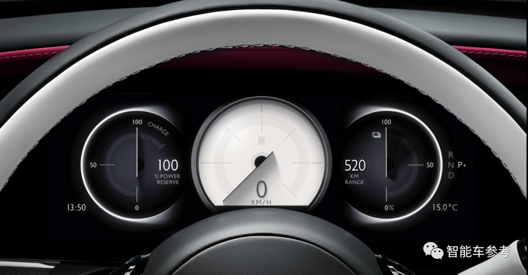 劳斯莱斯的燃油车没有转速表,只有动力储备表,这很像是电动车的仪表,所以闪灵可以照搬,并直接使用了全液晶仪表来凸显科技感。