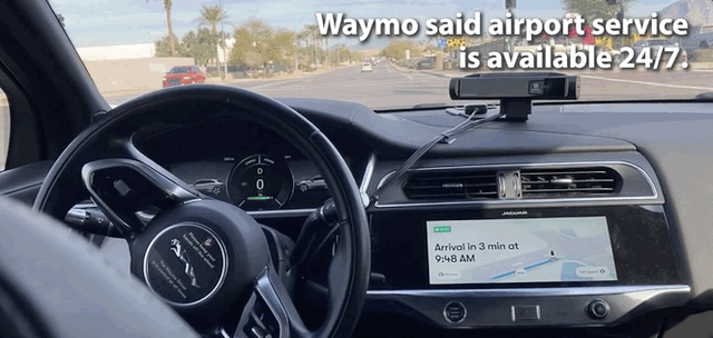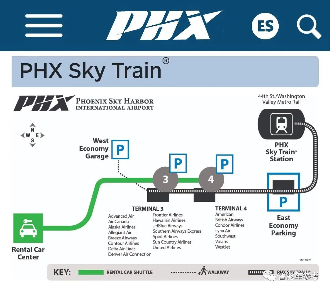 但需要注意的是,Waymo无人车并不是直接把你送到机场航站楼,而是送到离机场非常近的列车摆渡站点,这个地方叫做44th Street Sky Train station。