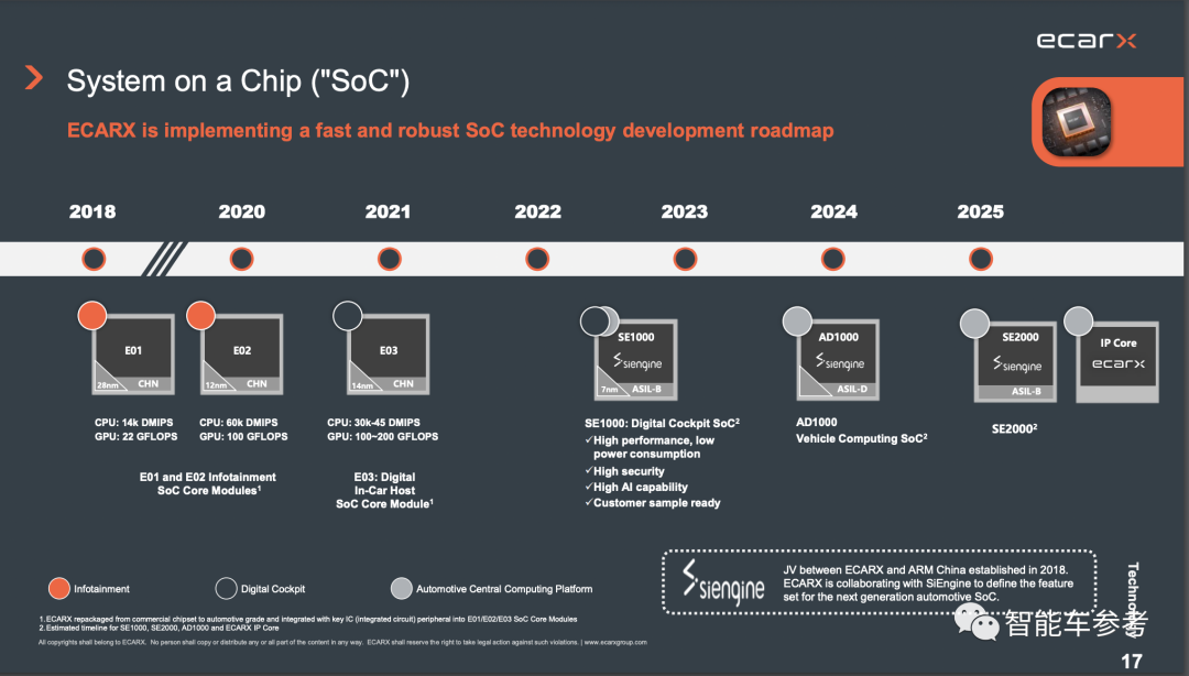 但亿咖通没有停止研发芯片。2018年,亿咖通和 ARM 中国等公司联合成立芯擎科技。2021年推出了中国第一颗7nm车规级 SoC 芯片SE1000,即“龍鹰一号”,对标高通8155,预计今年量产装车。