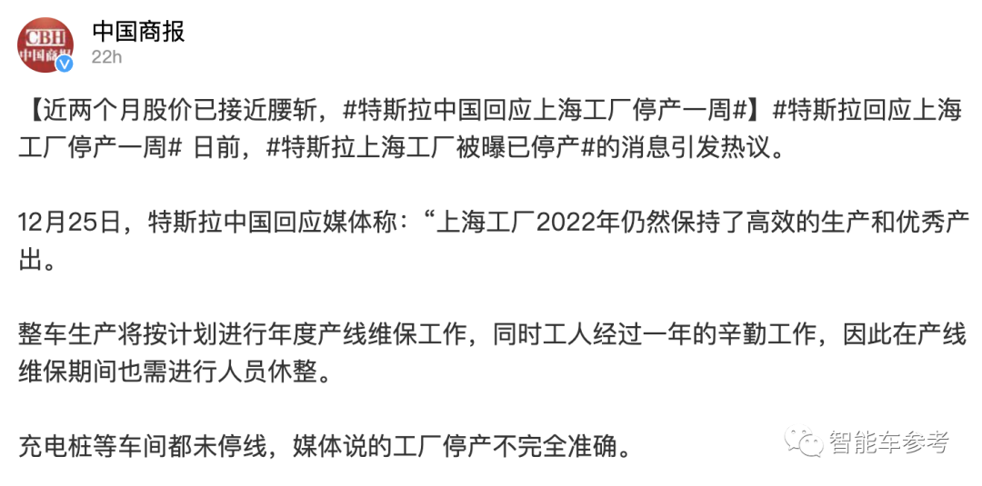“上海工厂2022年仍然保持了高效的生产和优秀产出。整车生产将按计划进行年度产线维保工作,同时工人经过一年的辛勤工作,因此在产线维保期间也需进行人员休整。充电桩等车间都未停线,媒体说的工厂停产不完全准确。”