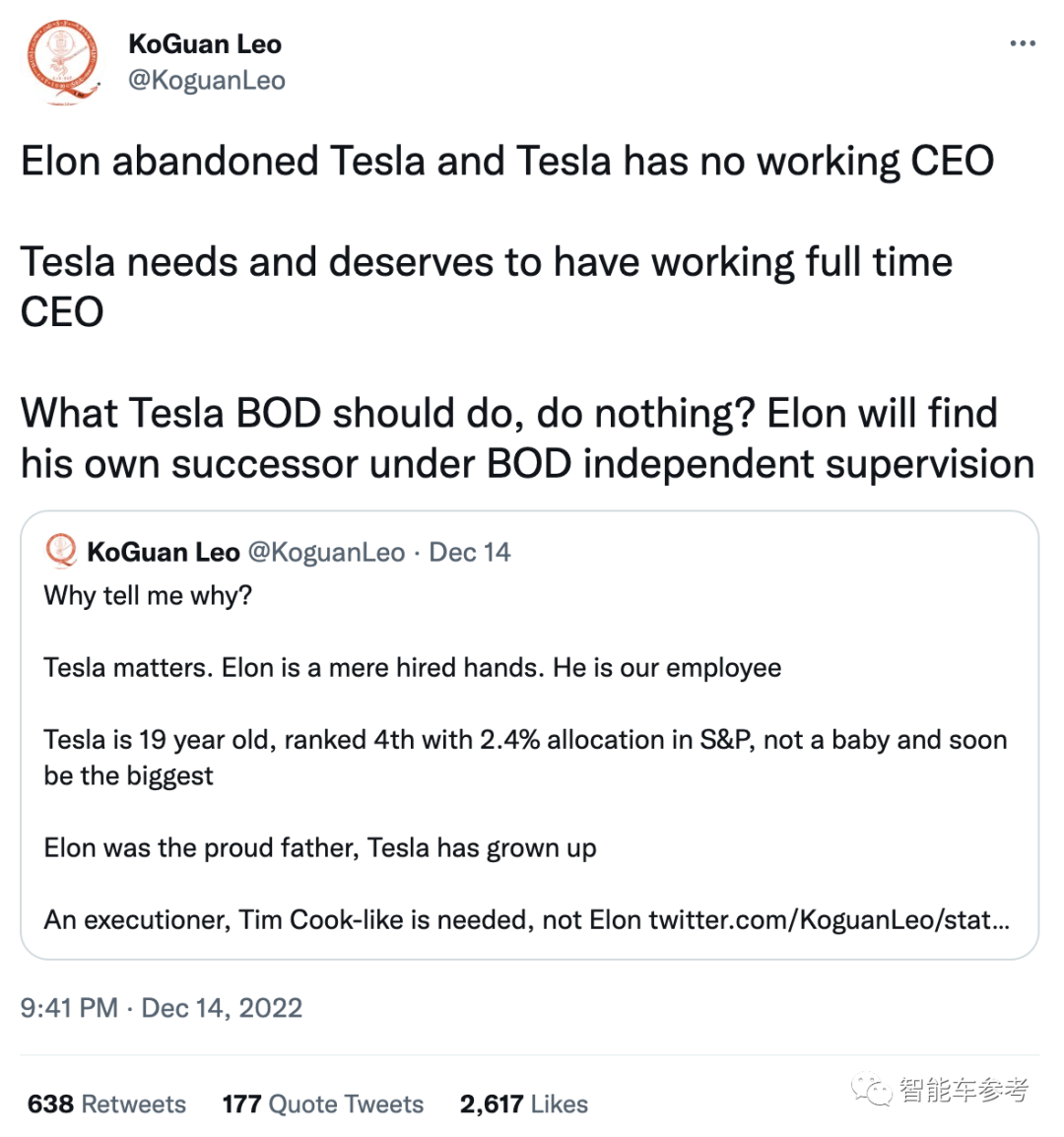 特斯拉第三大自然人股东廖凯原(KoGuan Leo)认为特斯拉需要能够全职工作的CEO,而且特斯拉也值得一个全职CEO。