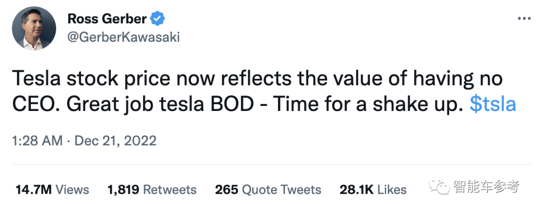 特斯拉长期投资者、曾经支持马斯克收购推特的罗斯·格柏也表示,特斯拉的股价就是没有CEO造成的。