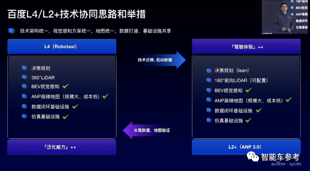 百度目前所采取的技术路径是,前期在限定区域实现技术积累,通过技术降维和L4数据,为L2+产品做热启动;更长期看,利用L2的规模优势,提前收集L4泛化所需要储备的长尾问题。