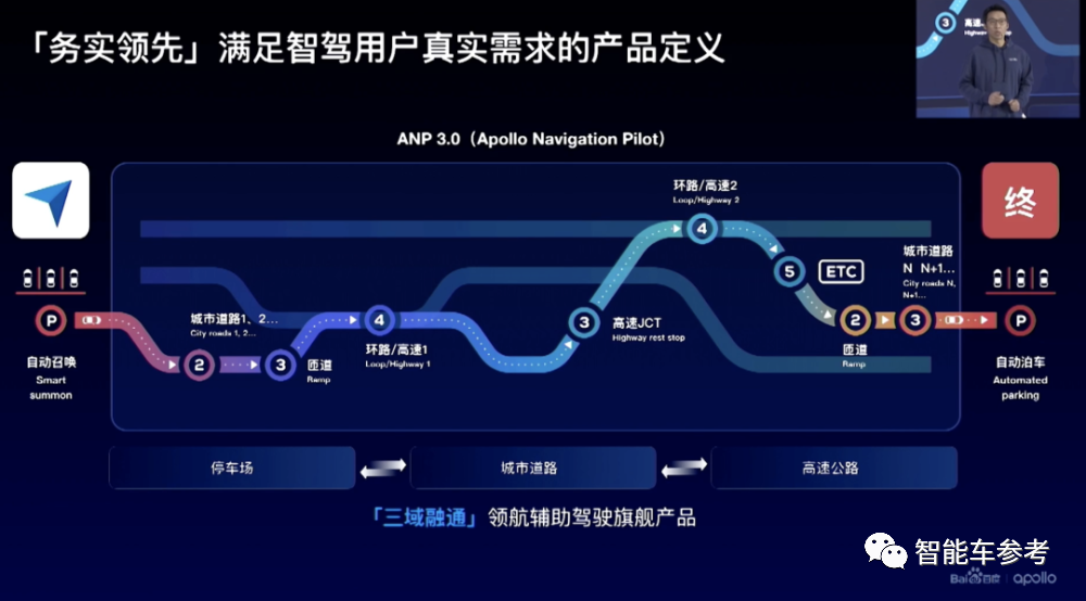再加上百度Apollo之前已经发布并量产的AVP——自主泊车,ANP+AVP,实际上就能实现家中停车位到公司停车位的日常驾驶全场景,可以说真正实现了泊车、高速和城市三域融通。
