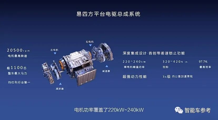 该电机功率覆盖了220kW到240kW,扭矩从320N·m到420N·m,效率高达97. 7%,最高转速做到了20500转,整车马力超1100匹;搭载“易四方”平台的越野车型,可实现3秒级的百公里加速。