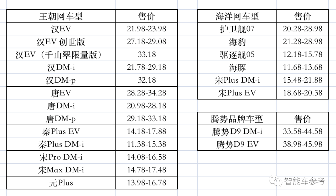比亚迪王朝和海洋系列在售的19款车,加上主打豪华的腾势品牌,已经为比亚迪拉开了一张覆盖10-50万价格区间的大网。