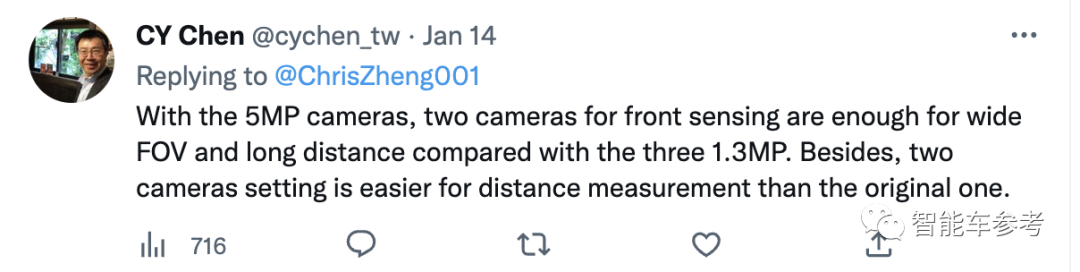 第一,原先前置3个摄像头,变成了2个,但分辨率提高。第二,之前官宣抛弃的毫米波雷达,又加了回来。