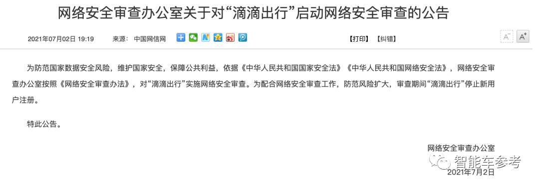 公告称对“滴滴出行”实施网络安全审查,审查期间“滴滴出行”停止新用户注册。