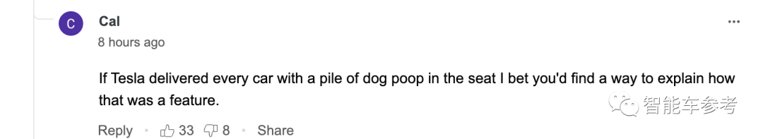 “特斯拉交付的车上摆一坨狗屎,你可能也要硬说这是一个功能。”
