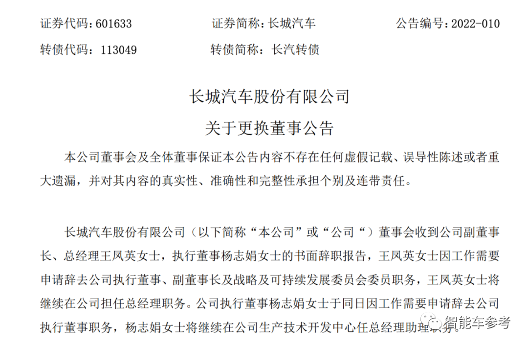 去年1月,王凤英主动辞职执行董事等职务,退位让贤。其后7月,王凤英辞去了总经理职位,也是她在长城汽车最后的一个职位。