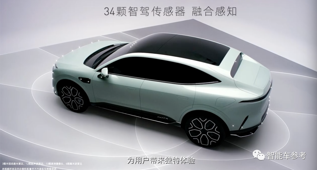 车身传感器包括3个激光雷达、6个毫米波雷达、13个摄像头、12个超声波雷达,外加400TOPS算力的智能驾驶硬件配置。
