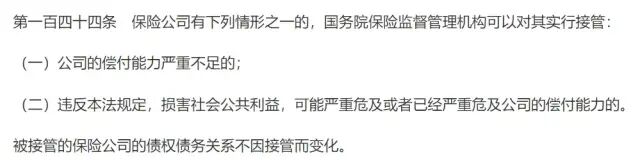 而易安保险被接管,原因是触发了保险法第一百四十四条规定: