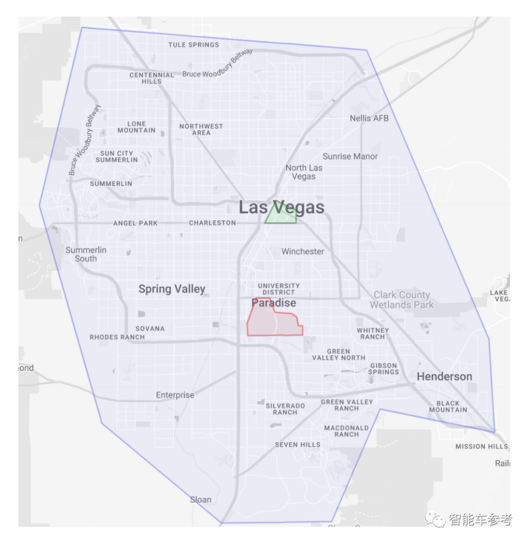如果取车地点在拉斯维加斯中心艺术区,车辆会由远程司机驾驶、前往指定地点;而在其他区域(蓝色部分),车辆会由司机开来。