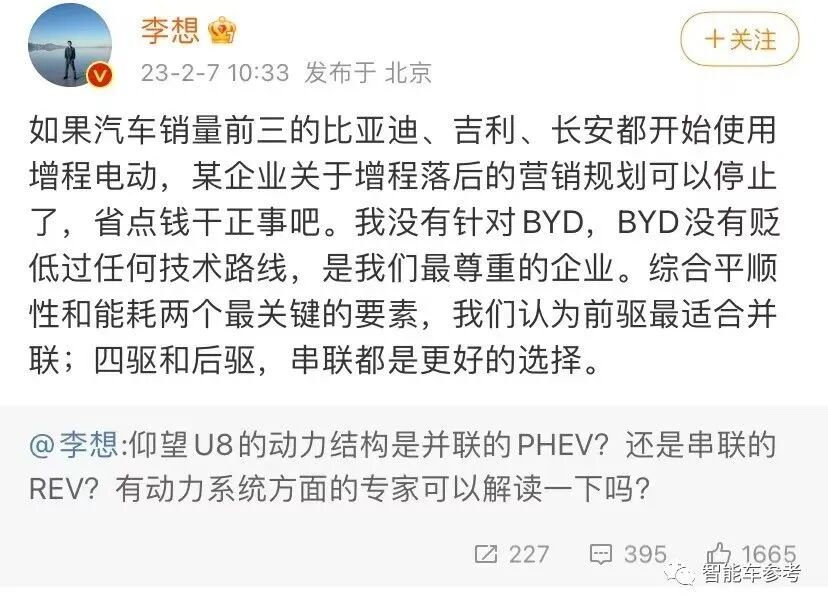 李想最新言论,把比亚迪和增程技术联系在了一起。