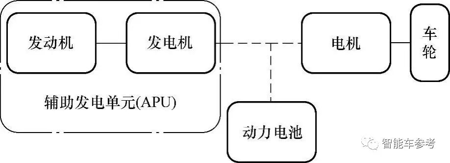 增程式电动汽车属于串联式,其动力结构较为简单,由电机直接驱动车轮,而发动机和发电机组成辅助发电单元,与动力电池联合为电机提供电能,发动机不直接参与驱动车轮。