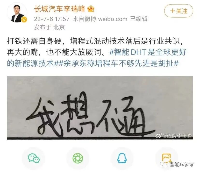 但很快余承东就遭到了“炮轰”,来自当时长城汽车旗下魏牌CEO李瑞峰: