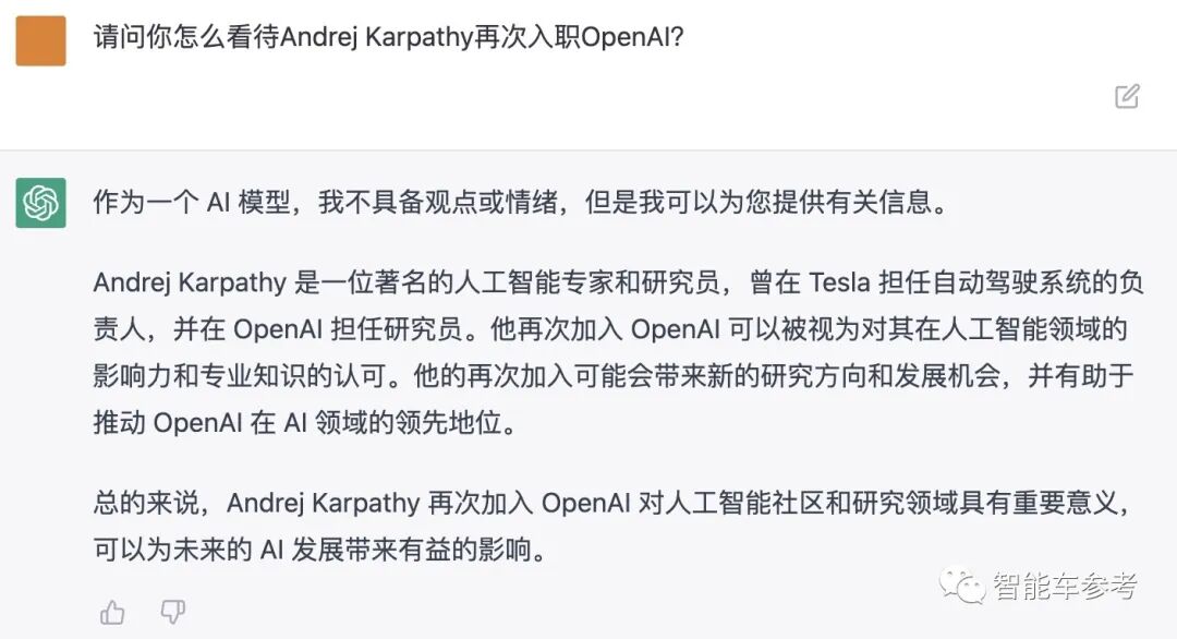 对于安德烈·卡帕斯再次加入OpenAI,我们也找来了ChatGPT问了问它的看法。
