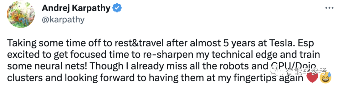 而卡帕斯自己出面解释说,已经工作了快5年,想要休息、旅游一下放放松。同时放假的时候也会专注自我提升,但会回来的,他很想念特斯拉的机器人和Dojo。