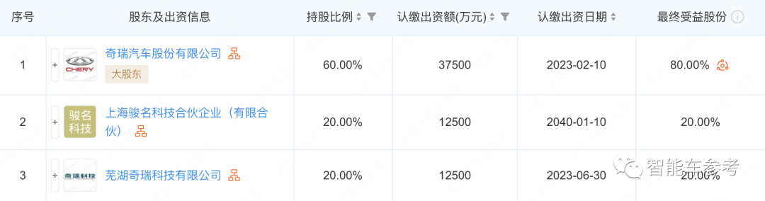 股东信息显示,大卓智能科技由奇瑞汽车股份有限公司、芜湖奇瑞科技有限公司、上海骏名科技合伙企业(有限合伙)共同持股。