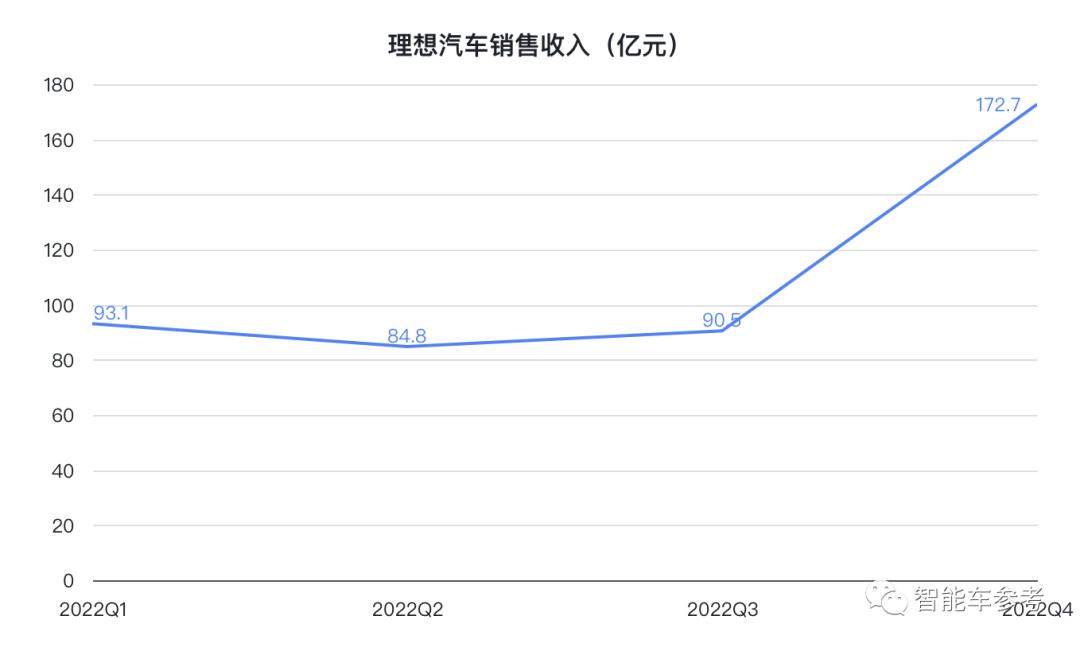 因此,理想第四季度汽车销售收入172.7亿,同比增长66.4%,环比增长90.8%。