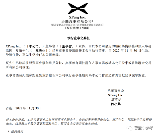 去年11月,小鹏汽车公告称夏珩辞去公司董事会执行董事职务。