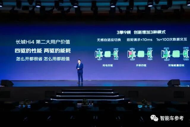 纯电两驱 (后驱)适用于绝大部分城市工况,是能耗和性能最为平衡的方案,当然市区工况电量不足时也可以用串联模式,其实就是增程式。不过长城Hi4的“增程式”模式,只在城市低速下开始,避免了高速状态先增程效率低油耗高的缺点。